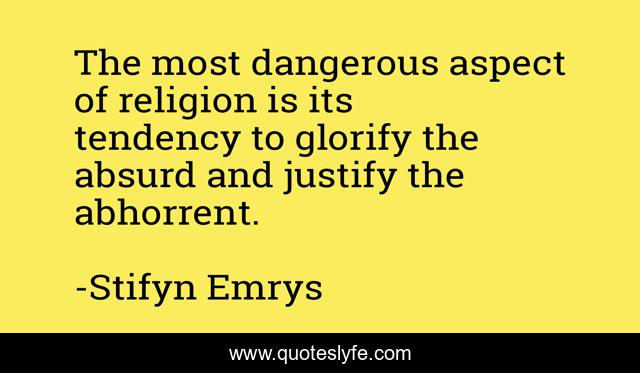 This page presents the quote "The most dangerous aspect of religion is its tendency to glorify the absurd and justify the abhorrent.". Author of this quote is Stifyn Emrys. This quote is about atheism, religion, philosophy,.