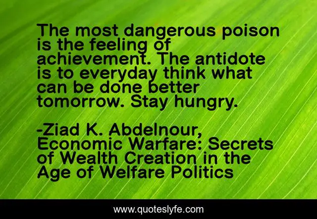 This page presents the quote "The most dangerous poison is the feeling of achievement. The antidote is to everyday think what can be done better tomorrow. Stay hungry.". Author of this quote is Ziad K. Abdelnour, Economic Warfare: Secrets of Wealth Creation in the Age of Welfare Politics. This quote is about hungry, achievement,.
