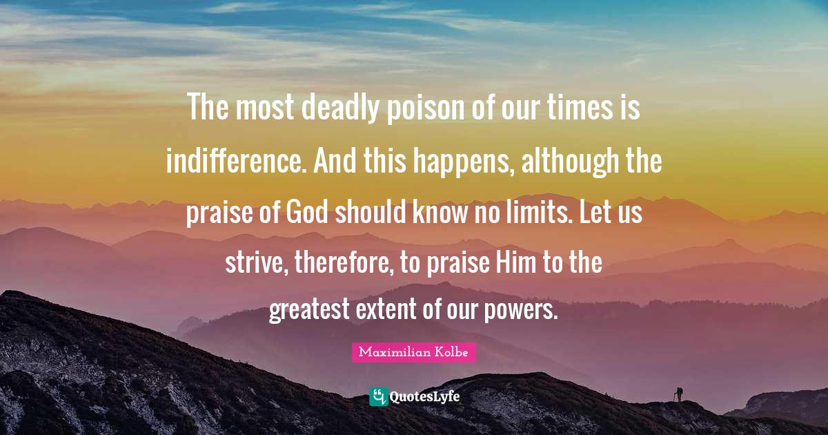 This page presents the quote "The most deadly poison of our times is indifference. And this happens, although the praise of God should know no limits. Let us strive, therefore, to praise Him to the greatest extent of our powers.". Author of this quote is Maximilian Kolbe. This quote is about limits, indifference, happens, strive, saint, god, poison, praise,.