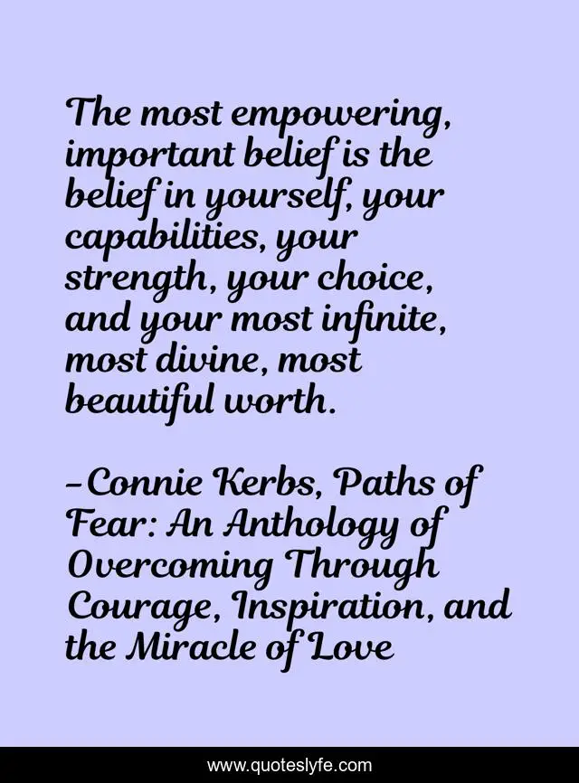 "Connie Kerbs, Paths of Fear: An Anthology of Overcoming Through Courage, Inspiration, and the Miracle of Love Quotes." Quoteslyfe.com, 2025. Fri. 05 Dec. 2025. <https://www.quoteslyfe.com/quote/The-most-empowering-important-belief-is-the-142724>.