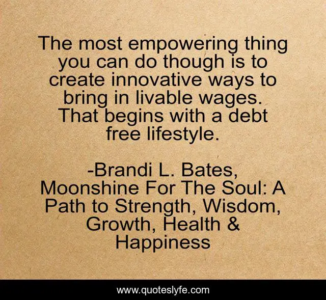 This page presents the quote "The most empowering thing you can do though is to create innovative ways to bring in livable wages. That begins with a debt free lifestyle.". Author of this quote is Brandi L. Bates, Moonshine For The Soul: A Path to Strength, Wisdom, Growth, Health & Happiness. This quote is about empowerment, success, brandi-bates, money, life, recession, stay-woke, wages, debt,.