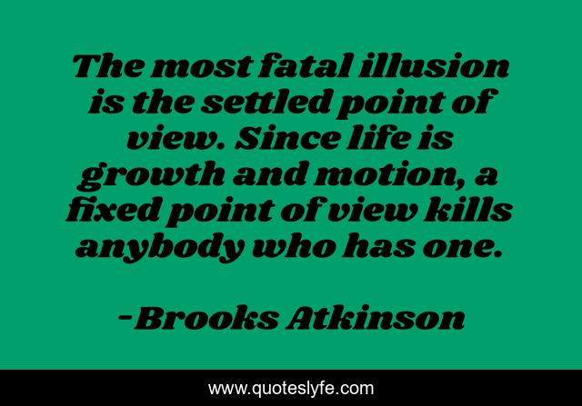 This page presents the quote "The most fatal illusion is the settled point of view. Since life is growth and motion, a fixed point of view kills anybody who has one.". Author of this quote is Brooks Atkinson. This quote is about inexperience, experience, open-mindeness, perspective, point-of-view, close-mindedness,.