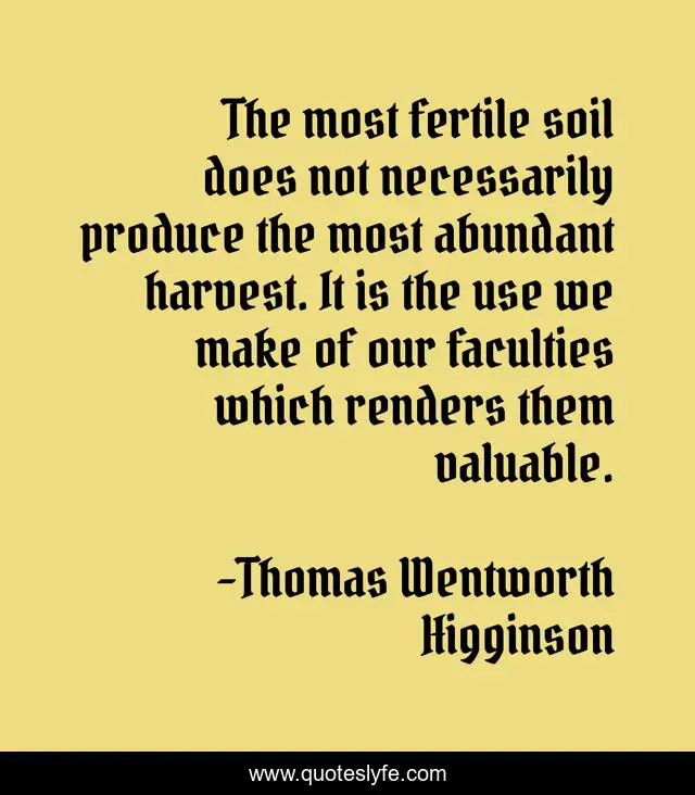 This page presents the quote "The most fertile soil does not necessarily produce the most abundant harvest. It is the use we make of our faculties which renders them valuable.". Author of this quote is Thomas Wentworth Higginson. This quote is about skills, life-philosophy, higginson, inspirational, enthusiasm,.