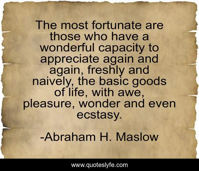 This page presents the quote "The most fortunate are those who have a wonderful capacity to appreciate again and again, freshly and naively, the basic goods of life, with awe, pleasure, wonder and even ecstasy.". Author of this quote is Abraham H. Maslow. This quote is about gratitude, thanksgiving, wonder,.