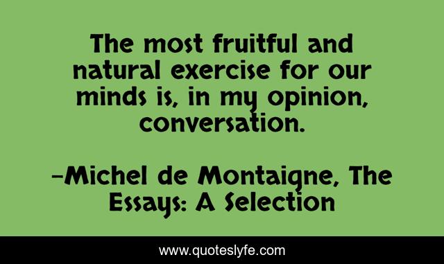 This page presents the quote "The most fruitful and natural exercise for our minds is, in my opinion, conversation.". Author of this quote is Michel de Montaigne, The Essays: A Selection. This quote is about conversation, mind,.