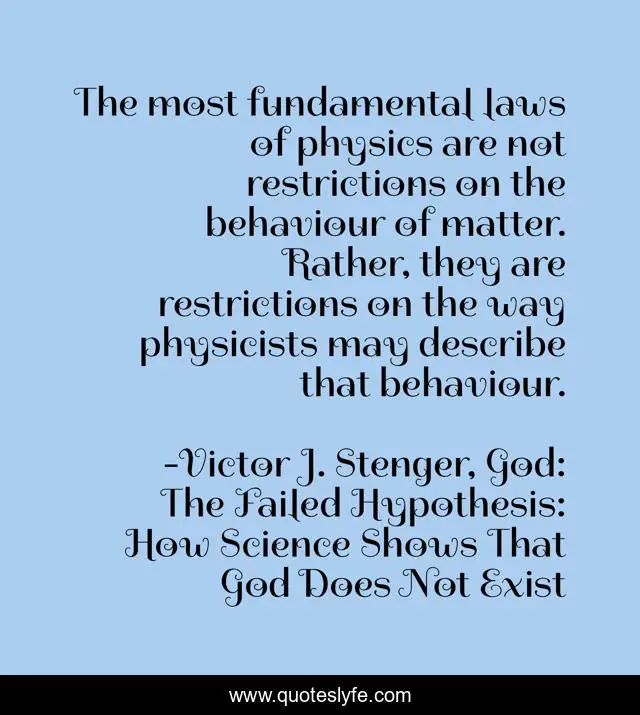 This page presents the quote "The most fundamental laws of physics are not restrictions on the behaviour of matter. Rather, they are restrictions on the way physicists may describe that behaviour.". Author of this quote is Victor J. Stenger, God: The Failed Hypothesis: How Science Shows That God Does Not Exist. This quote is about science, understanding, matter, math, physics, physical-laws,.
