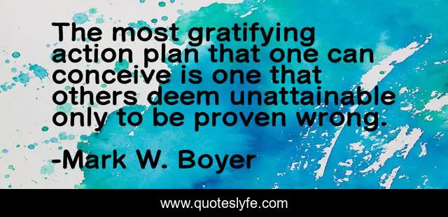 This page presents the quote "The most gratifying action plan that one can conceive is one that others deem unattainable only to be proven wrong.". Author of this quote is Mark W. Boyer. This quote is about confidence, positive, work-ethic, motivational, positive-thinking, optimistic, inspirational, enthusiasm, wisdom,.