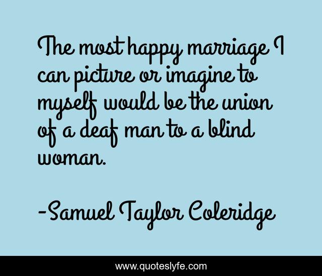 This page presents the quote "The most happy marriage I can picture or imagine to myself would be the union of a deaf man to a blind woman.". Author of this quote is Samuel Taylor Coleridge. This quote is about myself, happy, man,.