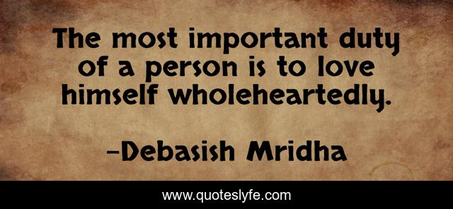 This page presents the quote "The most important duty of a person is to love himself wholeheartedly.". Author of this quote is Debasish Mridha. This quote is about life, love, knowledge, inspirational, intelligence, philosophy, wisdom, quotes, affection,.