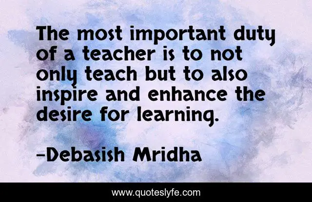 This page presents the quote "The most important duty of a teacher is to not only teach but to also inspire and enhance the desire for learning.". Author of this quote is Debasish Mridha. This quote is about philosophy, debasish-mridha, duty-of-a-teacher, quotes, debasish-mridha-md, inspirational, enthusiasm, teach, education,.