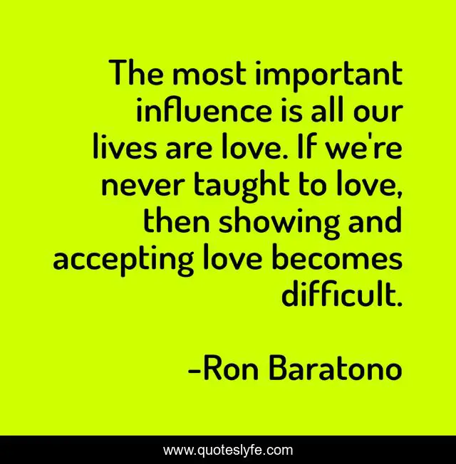 This page presents the quote "The most important influence is all our lives are love. If we're never taught to love, then showing and accepting love becomes difficult.". Author of this quote is Ron Baratono. This quote is about accepting, love, taught, influence, affection,.