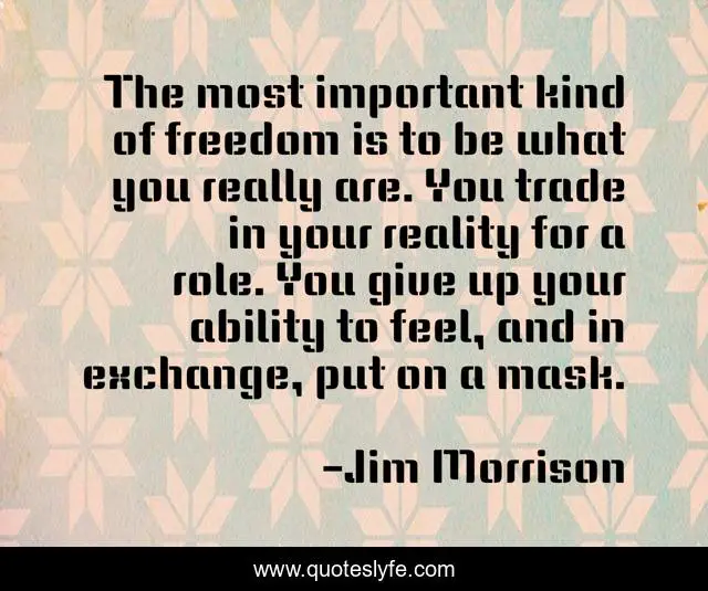 This page presents the quote "The most important kind of freedom is to be what you really are. You trade in your reality for a role. You give up your ability to feel, and in exchange, put on a mask.". Author of this quote is Jim Morrison. This quote is about mask, reality,.