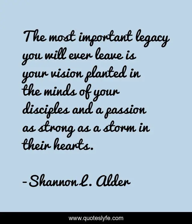"Shannon L. Alder Quotes." Quoteslyfe.com, 2025. Tue. 09 Dec. 2025. <https://www.quoteslyfe.com/quote/The-most-important-legacy-you-will-ever-113017>.