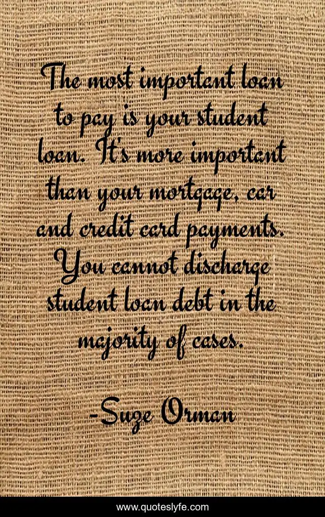 This page presents the quote "The most important loan to pay is your student loan. It's more important than your mortgage, car and credit card payments. You cannot discharge student loan debt in the majority of cases.". Author of this quote is Suze Orman. This quote is about credit, student,.