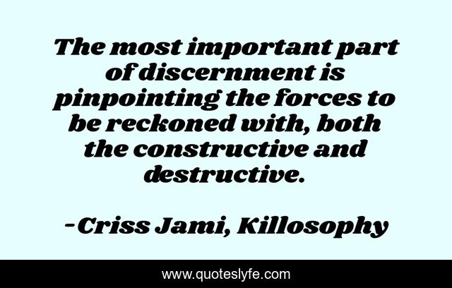 "Criss Jami, Killosophy Quotes." Quoteslyfe.com, 2025. Fri. 05 Dec. 2025. <https://www.quoteslyfe.com/quote/The-most-important-part-of-discernment-is-104769>.