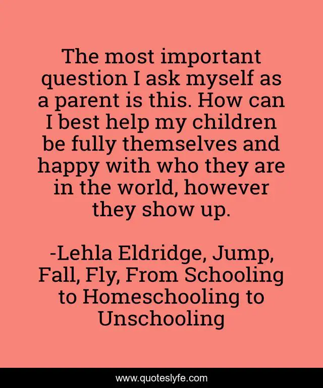 This page presents the quote "The most important question I ask myself as a parent is this. How can I best help my children be fully themselves and happy with who they are in the world, however they show up.". Author of this quote is Lehla Eldridge, Jump, Fall, Fly, From Schooling to Homeschooling to Unschooling. This quote is about rethinkingeducation, unschooling, selfconfidence, parenting, selfdirectedlearners, children, selfesteem,.