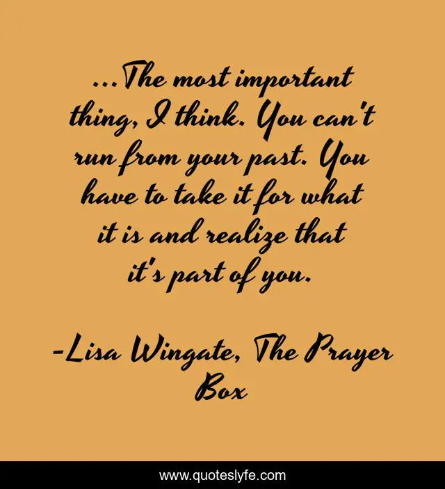 This page presents the quote "...The most important thing, I think. You can't run from your past. You have to take it for what it is and realize that it's part of you.". Author of this quote is Lisa Wingate, The Prayer Box. This quote is about past, life, moving-forward,.
