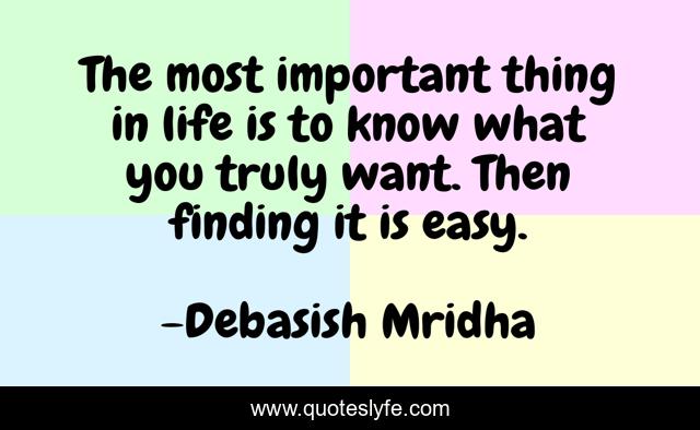 This page presents the quote "The most important thing in life is to know what you truly want. Then finding it is easy.". Author of this quote is Debasish Mridha. This quote is about finding-it-is-easy, debasish, mridha, philosophy, debasish-mridha, truly-want, know-what-you-want, important,.