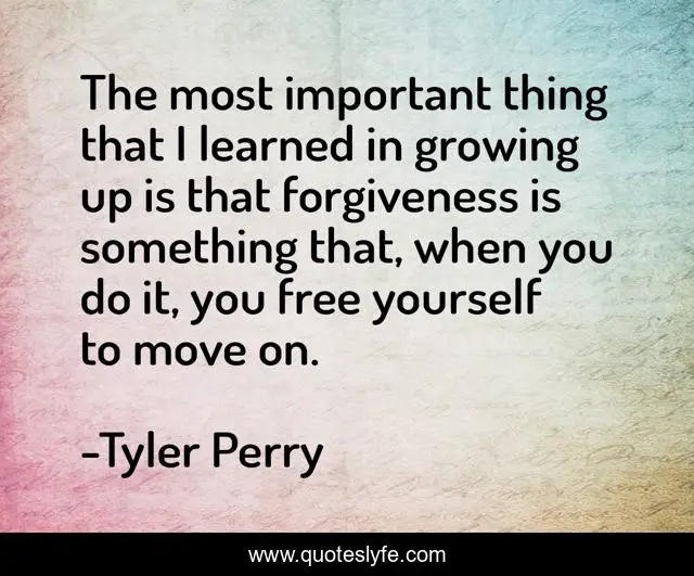 This page presents the quote "The most important thing that I learned in growing up is that forgiveness is something that, when you do it, you free yourself to move on.". Author of this quote is Tyler Perry. This quote is about growing up, free, yourself,.