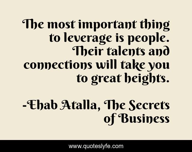 This page presents the quote "The most important thing to leverage is people. Their talents and connections will take you to great heights.". Author of this quote is Ehab Atalla, The Secrets of Business. This quote is about entrepreneur, entrepreneurial, business,.
