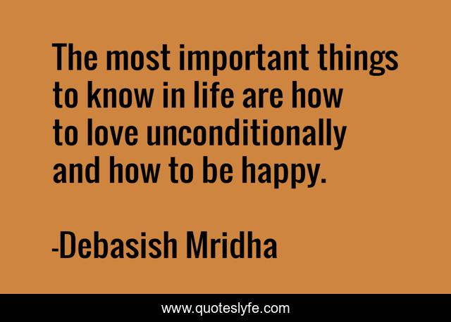 This page presents the quote "The most important things to know in life are how to love unconditionally and how to be happy.". Author of this quote is Debasish Mridha. This quote is about love-unconditionally, most-important-things-to-know, philosophy, debasish-mridha, quotes, debasish-mridha-md, inspirational, enthusiasm, know-how-to-be-happy,.