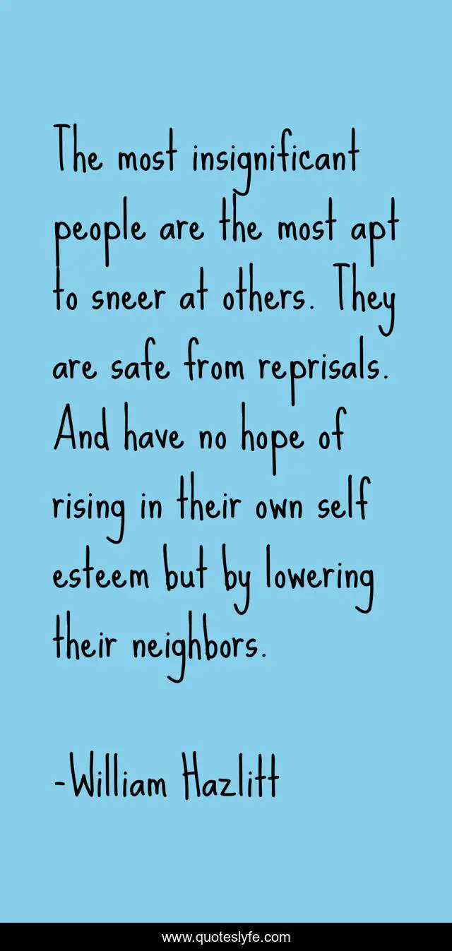 This page presents the quote "The most insignificant people are the most apt to sneer at others. They are safe from reprisals. And have no hope of rising in their own self esteem but by lowering their neighbors.". Author of this quote is William Hazlitt. This quote is about neighbors, self, people,.