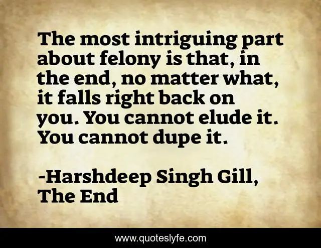 This page presents the quote "The most intriguing part about felony is that, in the end, no matter what, it falls right back on you. You cannot elude it. You cannot dupe it.". Author of this quote is Harshdeep Singh Gill, The End. This quote is about enthusiasm, life, truth-of-life, inspirational,.