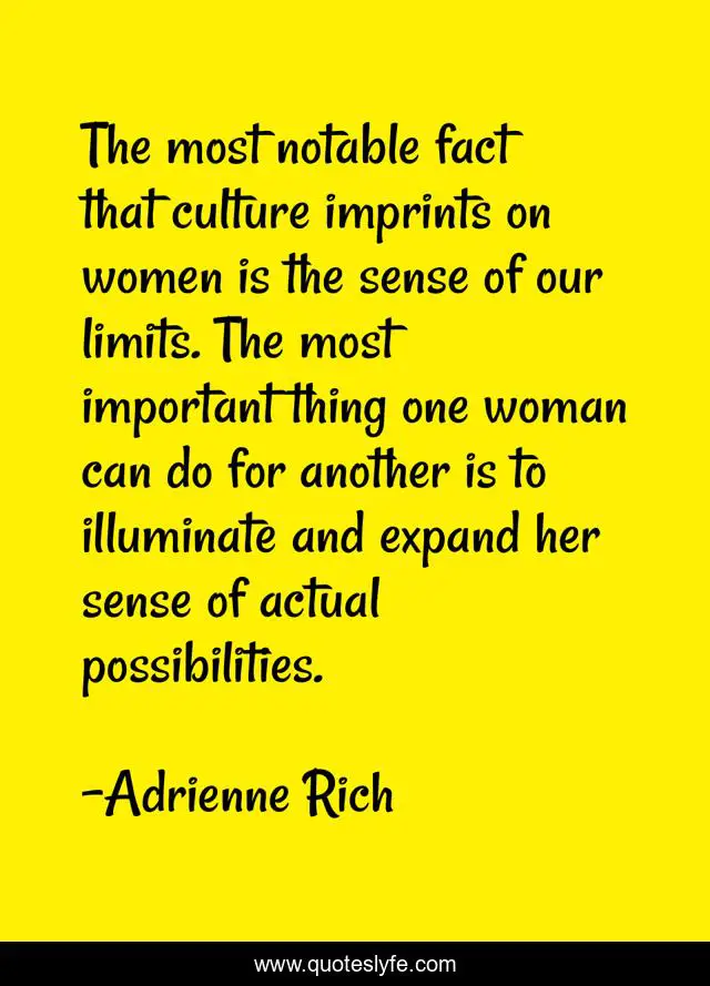 This page presents the quote "The most notable fact that culture imprints on women is the sense of our limits. The most important thing one woman can do for another is to illuminate and expand her sense of actual possibilities.". Author of this quote is Adrienne Rich. This quote is about helping, people,.