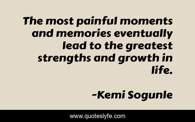 This page presents the quote "The most painful moments and memories eventually lead to the greatest strengths and growth in life.". Author of this quote is Kemi Sogunle. This quote is about moments-of-growth, life, strength, pain, life-changing-moments, moments, memories, transformation-spirituality, painful-memories,.