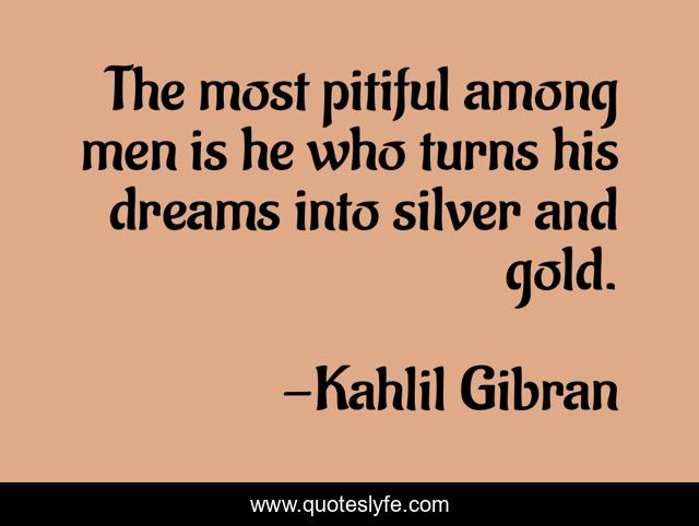 This page presents the quote "The most pitiful among men is he who turns his dreams into silver and gold.". Author of this quote is Kahlil Gibran. .