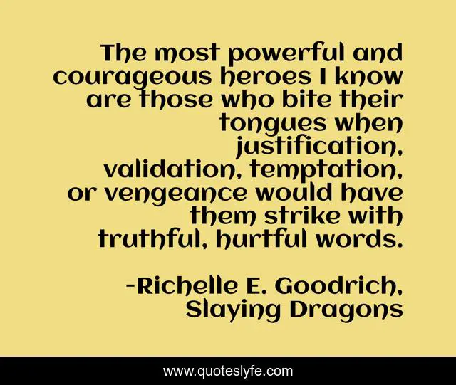This page presents the quote "The most powerful and courageous heroes I know are those who bite their tongues when justification, validation, temptation, or vengeance would have them strike with truthful, hurtful words.". Author of this quote is Richelle E. Goodrich, Slaying Dragons. This quote is about courage, justification, hero, temptation, hurtful-words, bite-your-tongue, vengeance, richelle, self-control,.