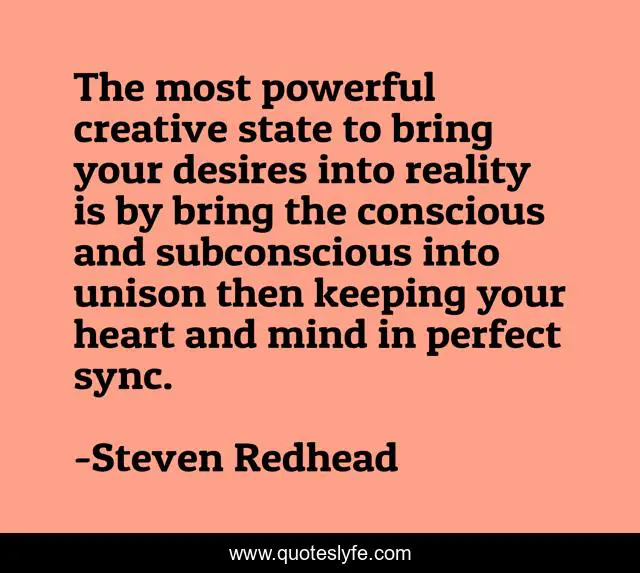 This page presents the quote "The most powerful creative state to bring your desires into reality is by bring the conscious and subconscious into unison then keeping your heart and mind in perfect sync.". Author of this quote is Steven Redhead. This quote is about heart, desires, conscious, powerful, mind, creative, subconscious, heart-and-mind, reality,.