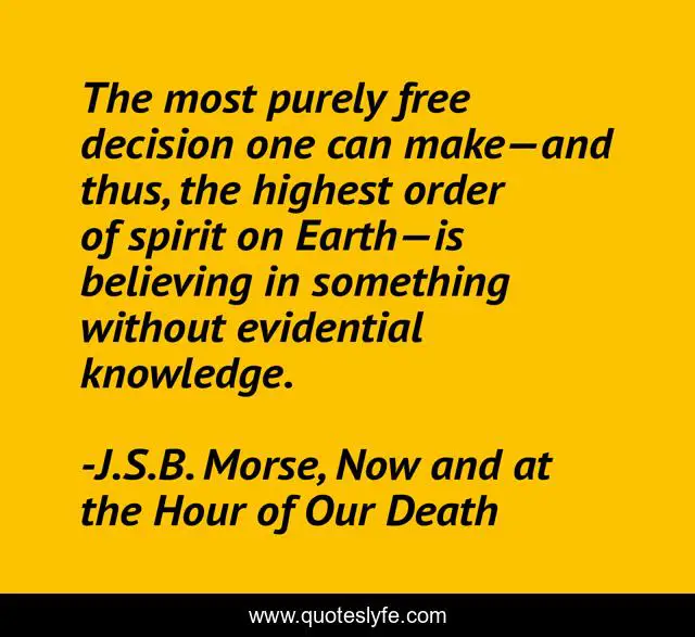 This page presents the quote "The most purely free decision one can make—and thus, the highest order of spirit on Earth—is believing in something without evidential knowledge.". Author of this quote is J.S.B. Morse, Now and at the Hour of Our Death. This quote is about faith, christian, belief, believers, god, free-will, religion, science,.