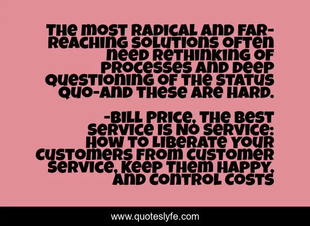 This page presents the quote "The most radical and far-reaching solutions often need rethinking of processes and deep questioning of the status quo-and these are hard.". Author of this quote is Bill Price, The Best Service Is No Service: How to Liberate Your Customers from Customer Service, Keep Them Happy, and Control Costs. This quote is about business, service,.
