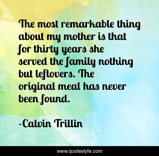 This page presents the quote "The most remarkable thing about my mother is that for thirty years she served the family nothing but leftovers. The original meal has never been found.". Author of this quote is Calvin Trillin. This quote is about food, leftovers, cooking, humor, mothers,.