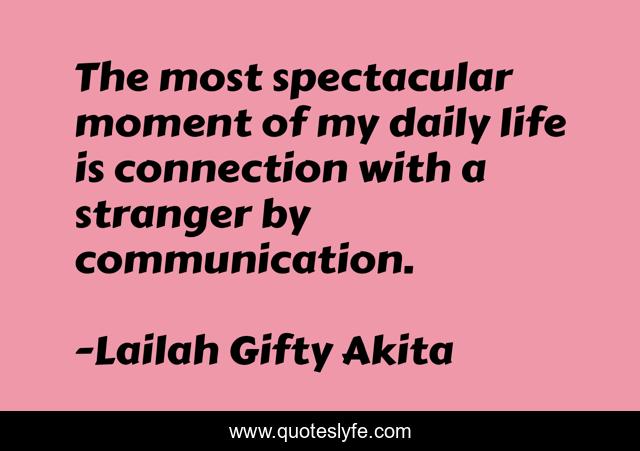 This page presents the quote "The most spectacular moment of my daily life is connection with a stranger by communication.". Author of this quote is Lailah Gifty Akita. This quote is about daily-life, lailah-gifty-akita-affirmations, communication, strangers, sharing-life, humanity,.