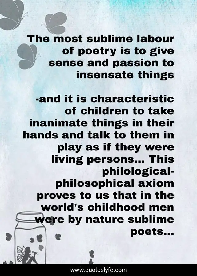 "and it is characteristic of children to take inanimate things in their hands and talk to them in play as if they were living persons... This philological-philosophical axiom proves to us that in the world's childhood men were by nature sublime poets... Quotes." Quoteslyfe.com, 2025. Fri. 05 Dec. 2025. <https://www.quoteslyfe.com/quote/The-most-sublime-labour-of-poetry-is-190968>.