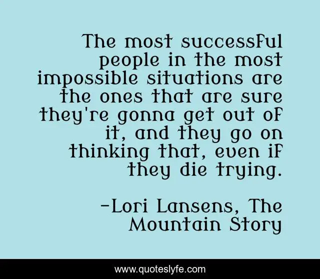 This page presents the quote "The most successful people in the most impossible situations are the ones that are sure they're gonna get out of it, and they go on thinking that, even if they die trying.". Author of this quote is Lori Lansens, The Mountain Story. This quote is about enthusiasm, strength, struggle, inspirational,.