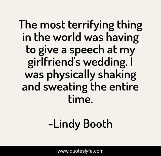 This page presents the quote "The most terrifying thing in the world was having to give a speech at my girlfriend's wedding. I was physically shaking and sweating the entire time.". Author of this quote is Lindy Booth. This quote is about world, speech, time,.