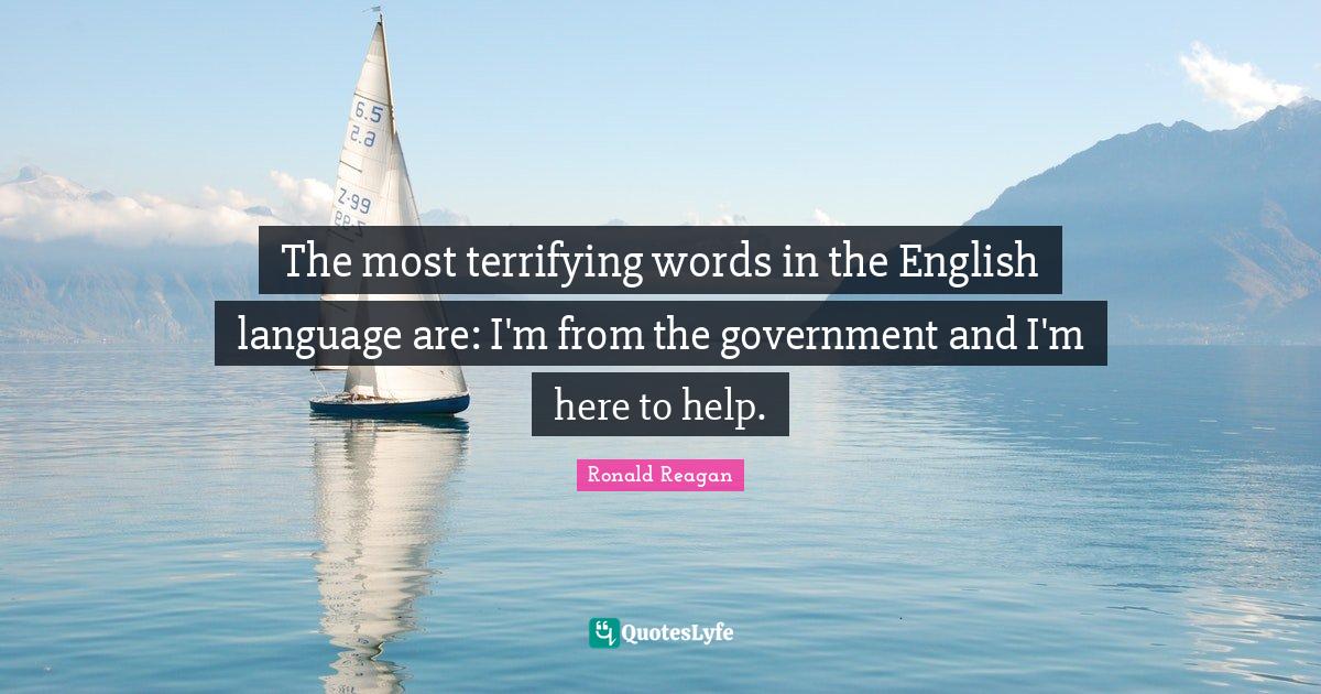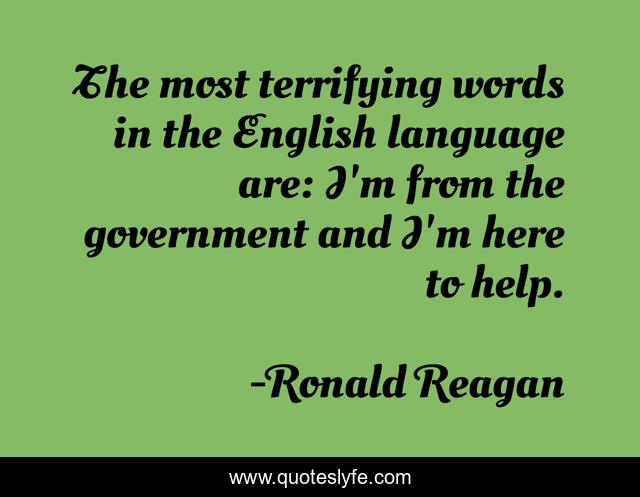 This page presents the quote "The most terrifying words in the English language are: I'm from the government and I'm here to help.". Author of this quote is Ronald Reagan. This quote is about language, words, help,.