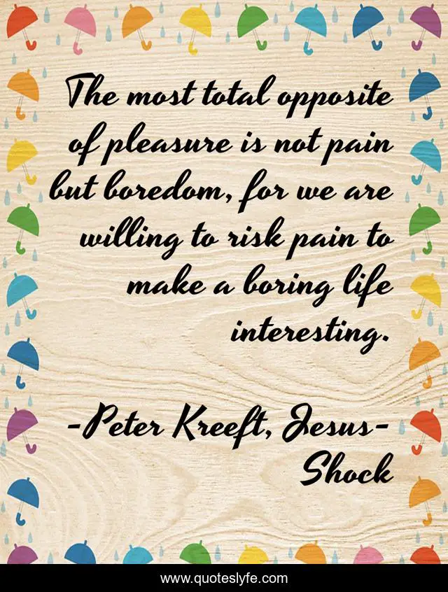 This page presents the quote "The most total opposite of pleasure is not pain but boredom, for we are willing to risk pain to make a boring life interesting.". Author of this quote is Peter Kreeft, Jesus-Shock. This quote is about catholicism, philosophy, jesus-shock, christianity, spirituality, boredom, pleasure, theology,.