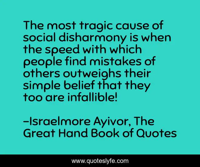 This page presents the quote "The most tragic cause of social disharmony is when the speed with which people find mistakes of others outweighs their simple belief that they too are infallible!". Author of this quote is Israelmore Ayivor, The Great Hand Book of Quotes. This quote is about outweigh, conflict, food-for-thought, disharmony, belief, people, simple, social-conflict, disagreement,.
