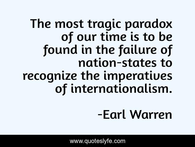 This page presents the quote "The most tragic paradox of our time is to be found in the failure of nation-states to recognize the imperatives of internationalism.". Author of this quote is Earl Warren. This quote is about failure, paradox, time,.