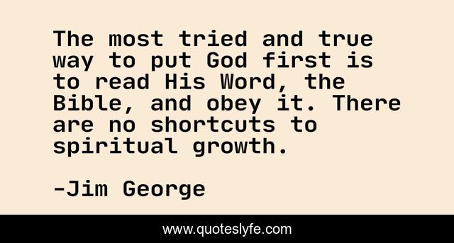This page presents the quote "The most tried and true way to put God first is to read His Word, the Bible, and obey it. There are no shortcuts to spiritual growth.". Author of this quote is Jim George. This quote is about spiritual-growth, bible, jim-george, god, man-of-god, christian-living, godly-man,.