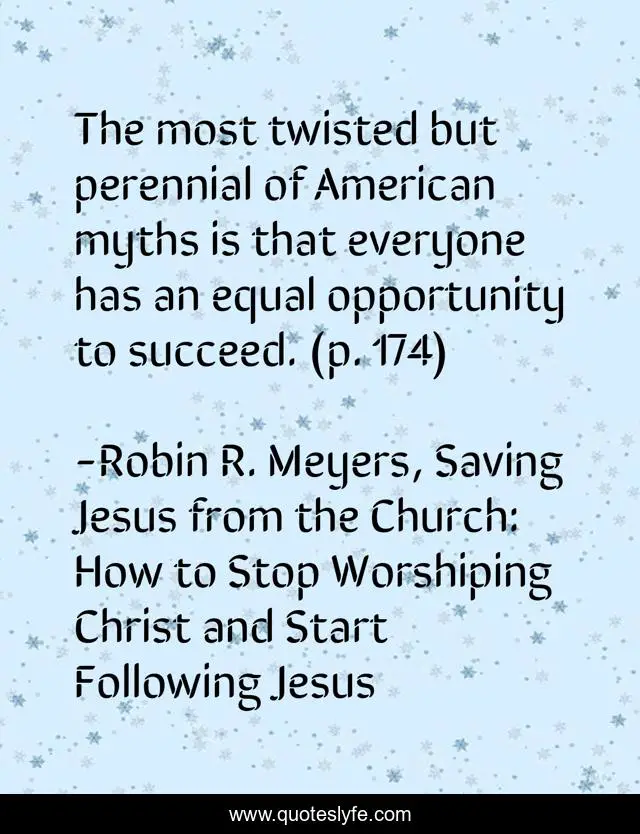 This page presents the quote "The most twisted but perennial of American myths is that everyone has an equal opportunity to succeed. (p. 174)". Author of this quote is Robin R. Meyers, Saving Jesus from the Church: How to Stop Worshiping Christ and Start Following Jesus. .