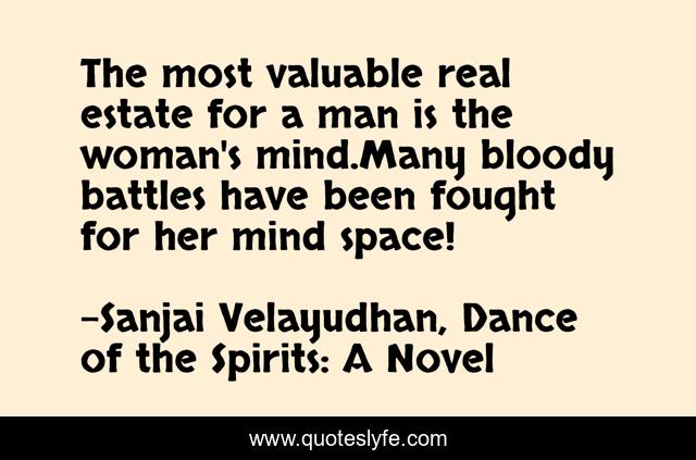 This page presents the quote "The most valuable real estate for a man is the woman's mind.Many bloody battles have been fought for her mind space!". Author of this quote is Sanjai Velayudhan, Dance of the Spirits: A Novel. This quote is about woman, mind, battles, kerala, book, mindspace, war,.