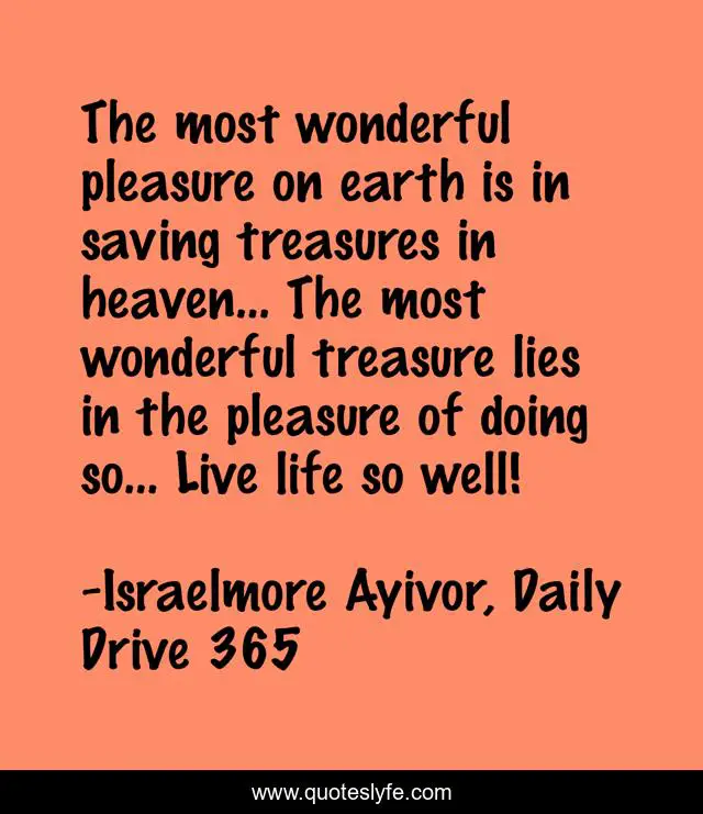 This page presents the quote "The most wonderful pleasure on earth is in saving treasures in heaven... The most wonderful treasure lies in the pleasure of doing so... Live life so well!". Author of this quote is Israelmore Ayivor, Daily Drive 365. This quote is about food-for-thought, heaven, enjoy-life, god, treasure, life, rewards, earth, israelmore-ayivor,.