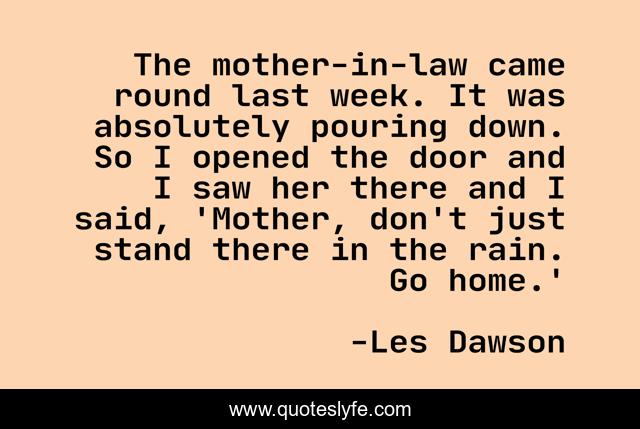 This page presents the quote "The mother-in-law came round last week. It was absolutely pouring down. So I opened the door and I saw her there and I said, 'Mother, don't just stand there in the rain. Go home.'". Author of this quote is Les Dawson. This quote is about door, rain, mother,.