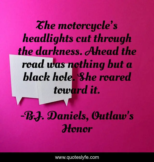 This page presents the quote "The motorcycle’s headlights cut through the darkness. Ahead the road was nothing but a black hole. She roared toward it.". Author of this quote is B.J. Daniels, Outlaw's Honor. This quote is about thriller, cowboys, western-romance, western-romantic-suspense, gypsies,.