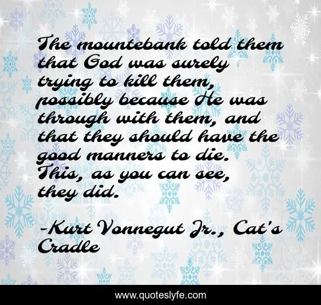 This page presents the quote "The mountebank told them that God was surely trying to kill them, possibly because He was through with them, and that they should have the good manners to die. This, as you can see, they did.". Author of this quote is Kurt Vonnegut Jr., Cat's Cradle. This quote is about mock-biography, humor, science-fiction,.